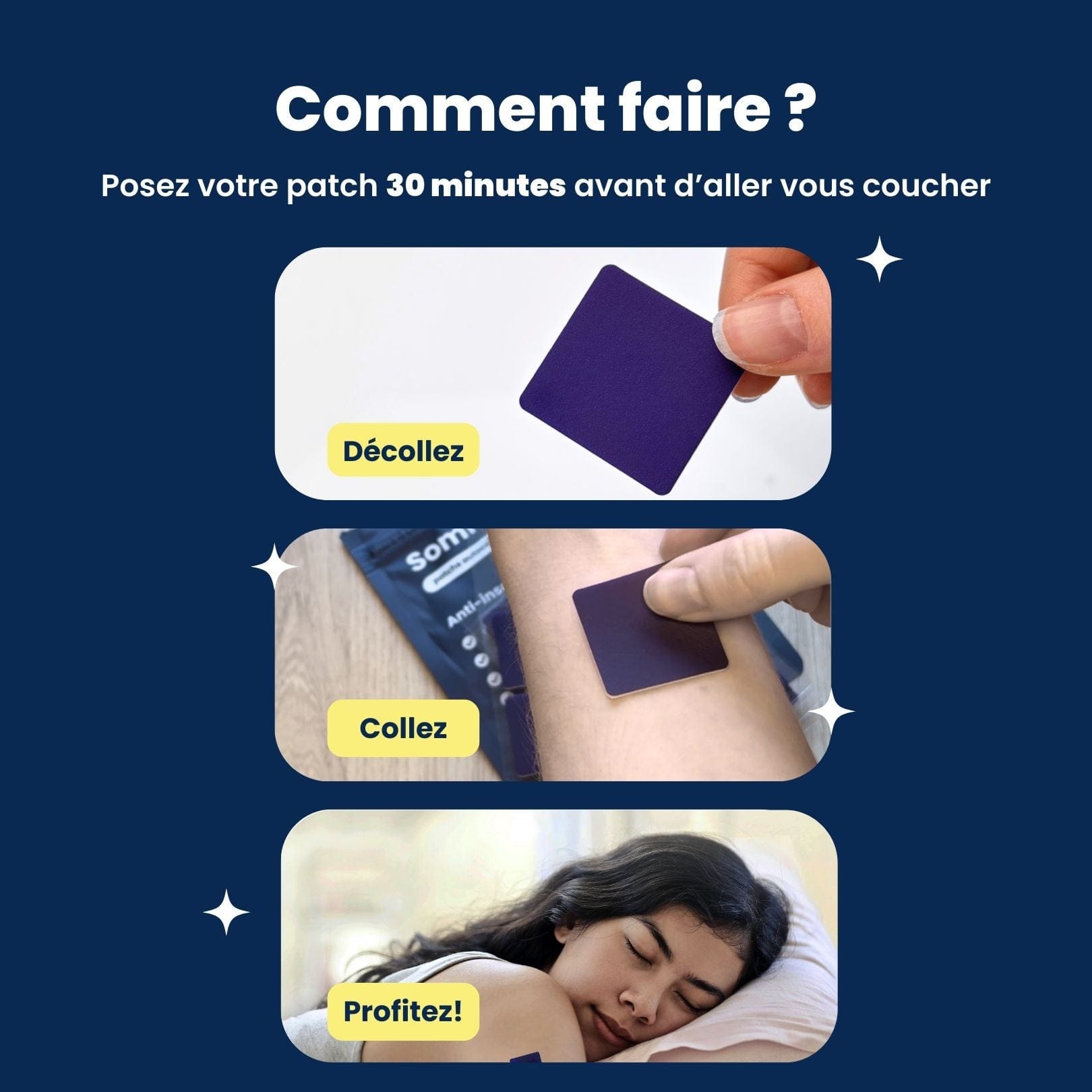 Comment ? Grâce à des patchs composés d'ingrédients d'origine naturelle qui réduisent l'anxiété, le stress et permettent une relaxation profonde ainsi qu'un endormissement accéléré.
