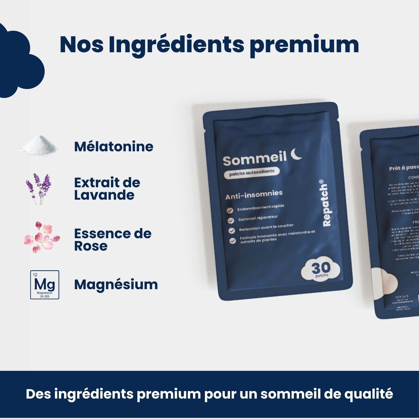 Très simplement, notre patch anti-insomnie libère de la mélatonine, de l'extrait de rose, de la lavande et du magnésium à travers la peau tout au long de la nuit, durant 8 à 10 heures.